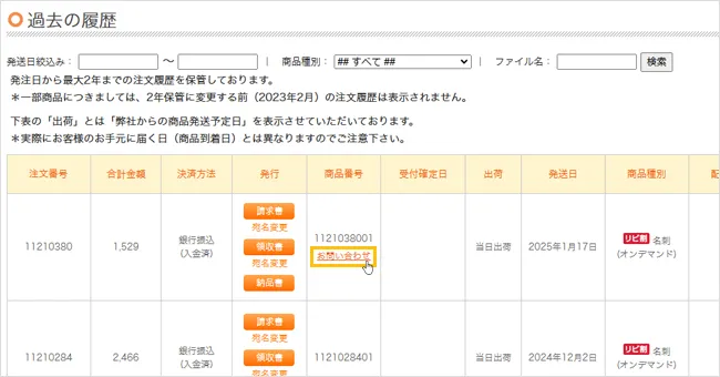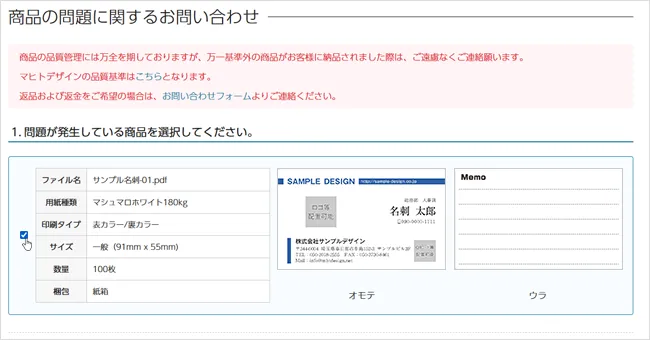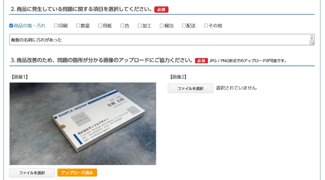 - ・再印刷「商品の問題に関するお問い合わせ」より「再印刷を希望する」にチェックをいれ、申請ください。