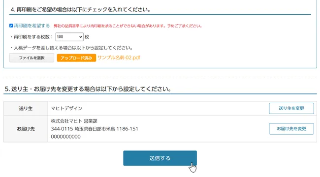 4.再印刷をご希望の場合は「再印刷を希望する」にチェックを入れ、各項目選択、アップロードをして送信してください。