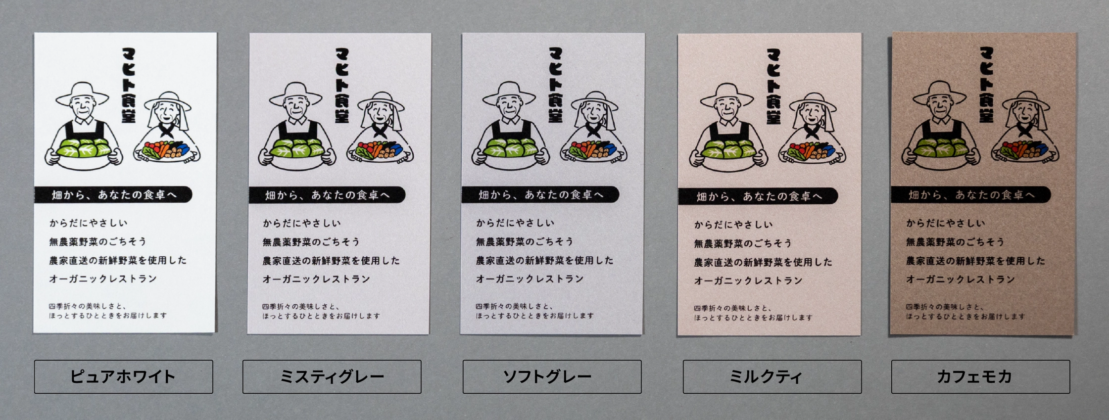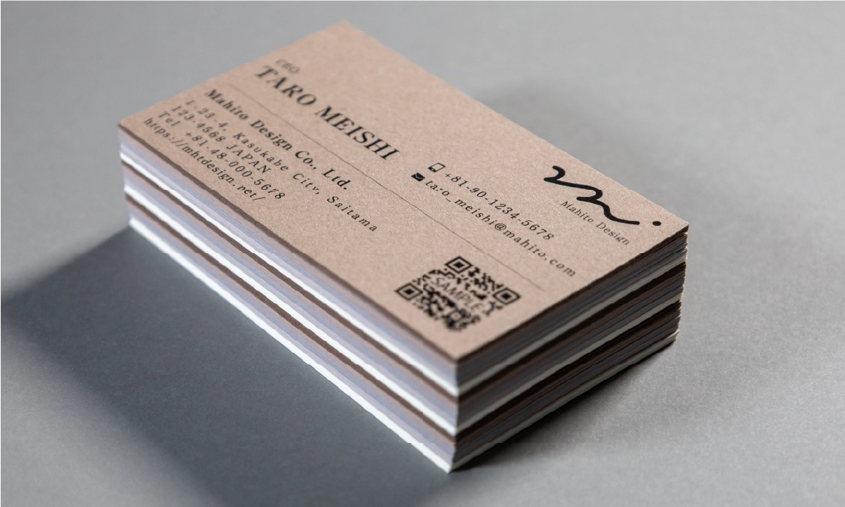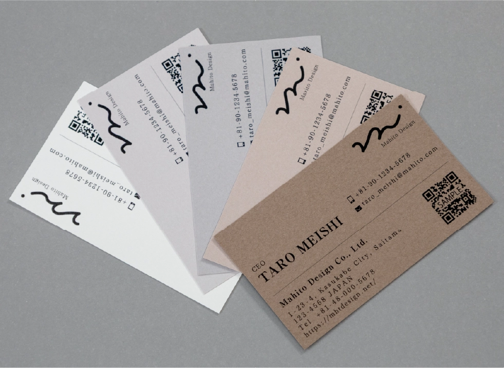 マヒトの色アソート名刺は、1つのデザインで5色のバリエーションを楽しめる名刺です。100枚(各色20枚ずつ)から作れるので、渡す相手や場面に応じて印象を切り替えられるのが特徴です。1色では伝えきれない表現ができ、会話のきっかけにもなり、色で使い分けたい方や、表現に変化をつけたい方におすすめです。なお、気に入った色があれば、1色に揃えた名刺を100枚で作成することも可能です。